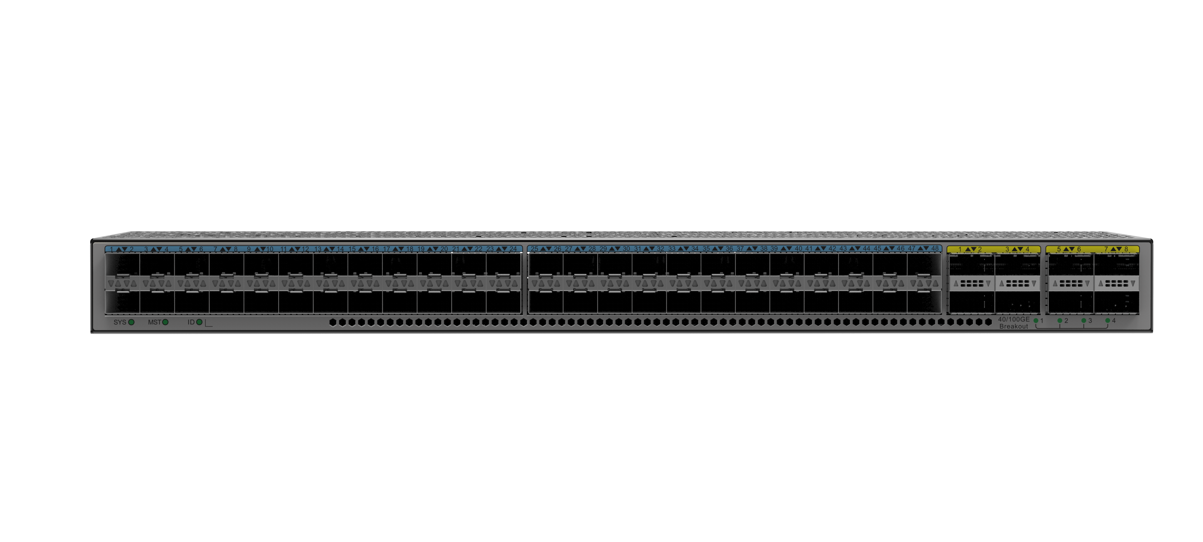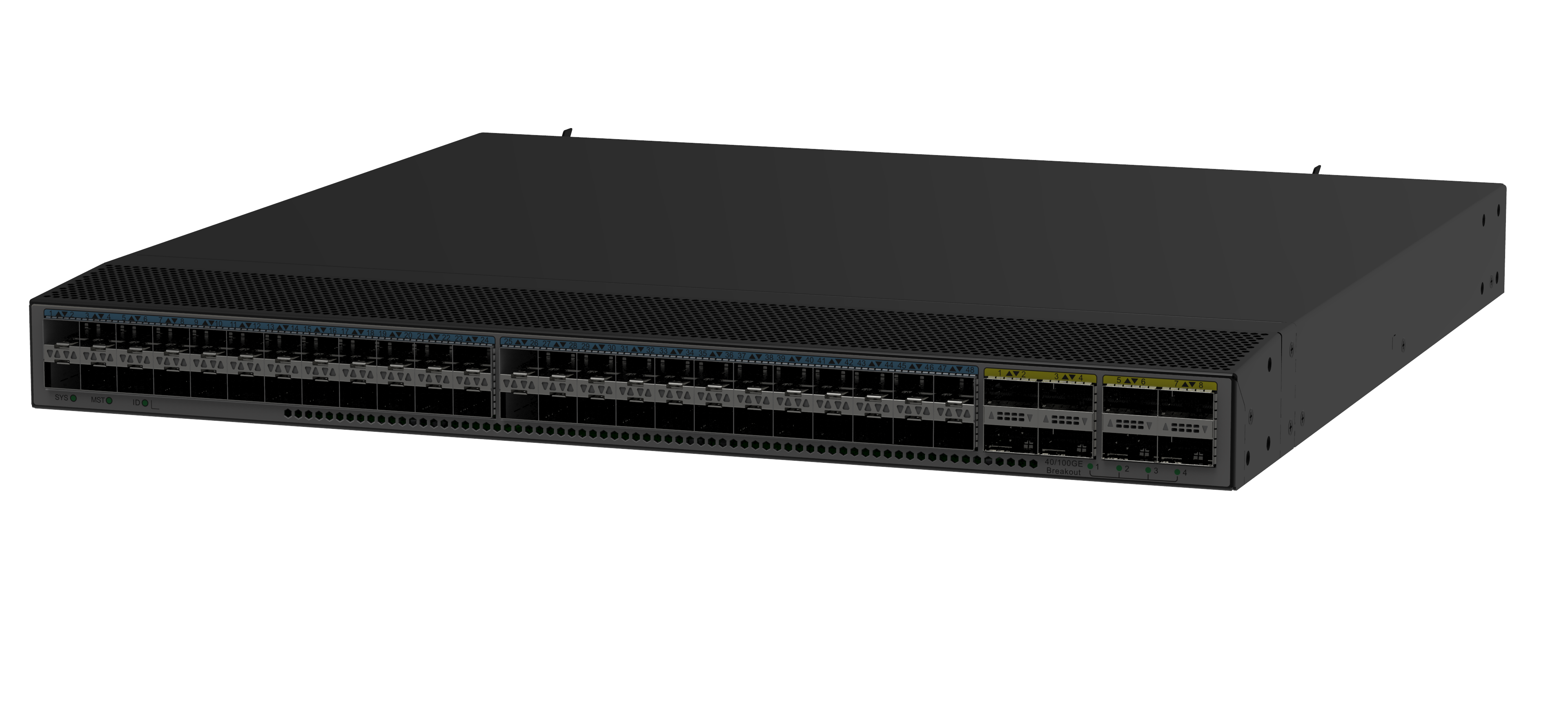 最大提供 48 个 25GE 接口,满足 10GE/25GE 服务器高密接入需求;最大支持 8 个 100GE 高性能 QSFP28 接口, 也可拆分为 4 个 25GE SFP28 接口使用,提供灵活的组网能力;