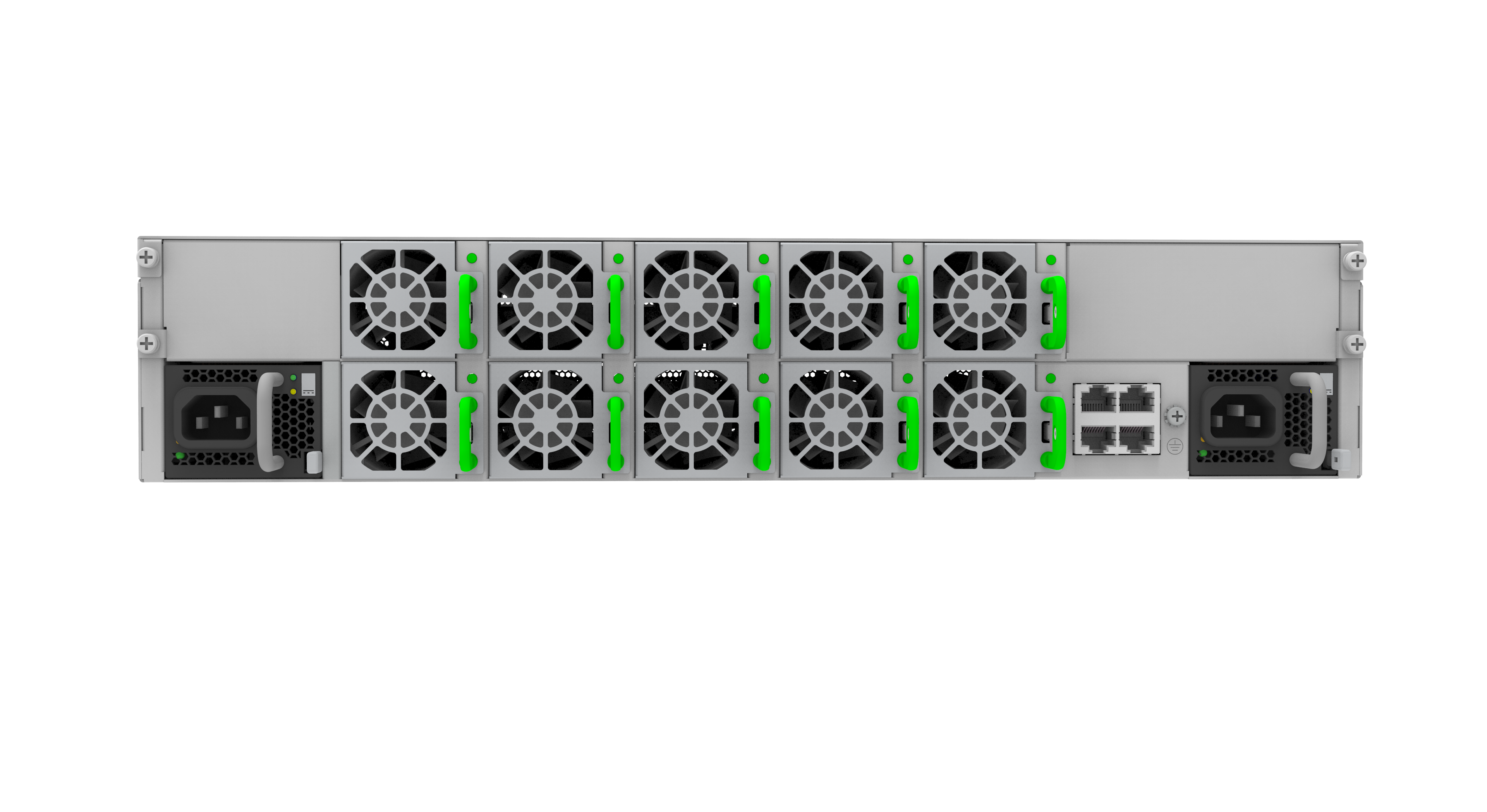 所有端口都在前端; PSU和风扇在后端可插拔;